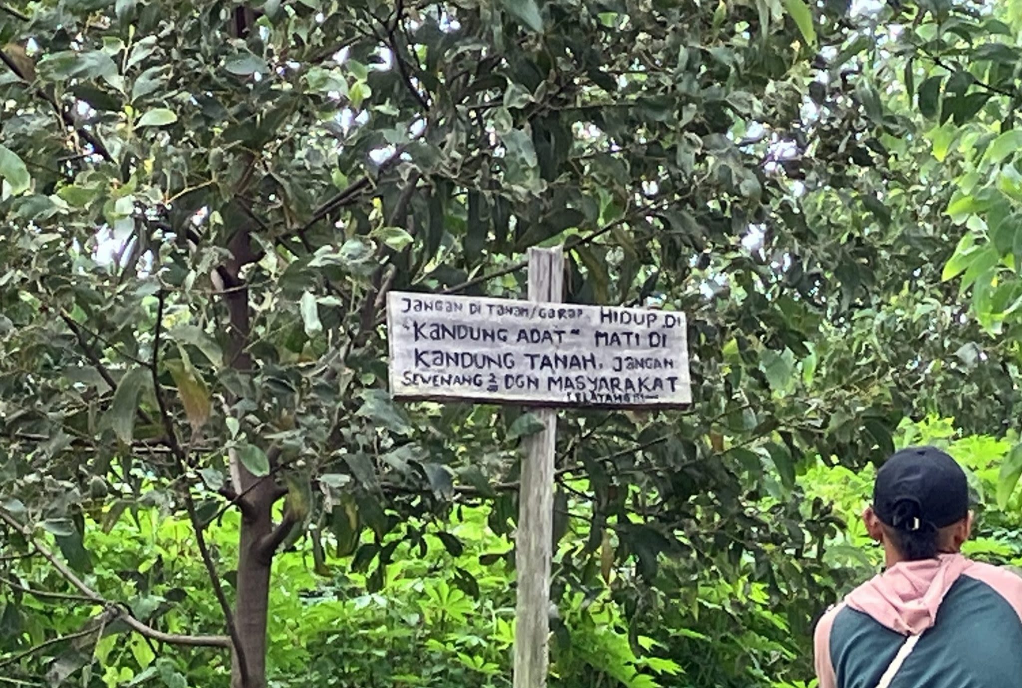 Image by JATAN of message board inside concession: "Life is conceived by adat, death is conceived by land"