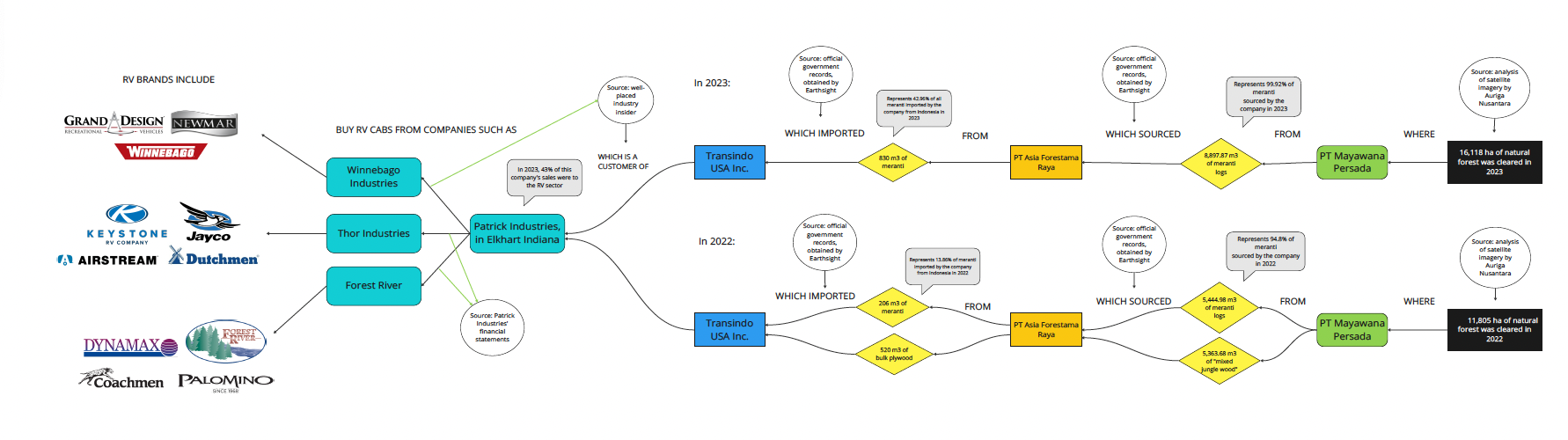 The New York Times reports that Transindo USA, in turn, sells plywood to Patrick Industries, a major US RV parts manufacturer which supplies many of the best-known American RV brands including Winnebago, Thor Industries and Forest River Inc. Transindo's website states that they supply to the RV industry.