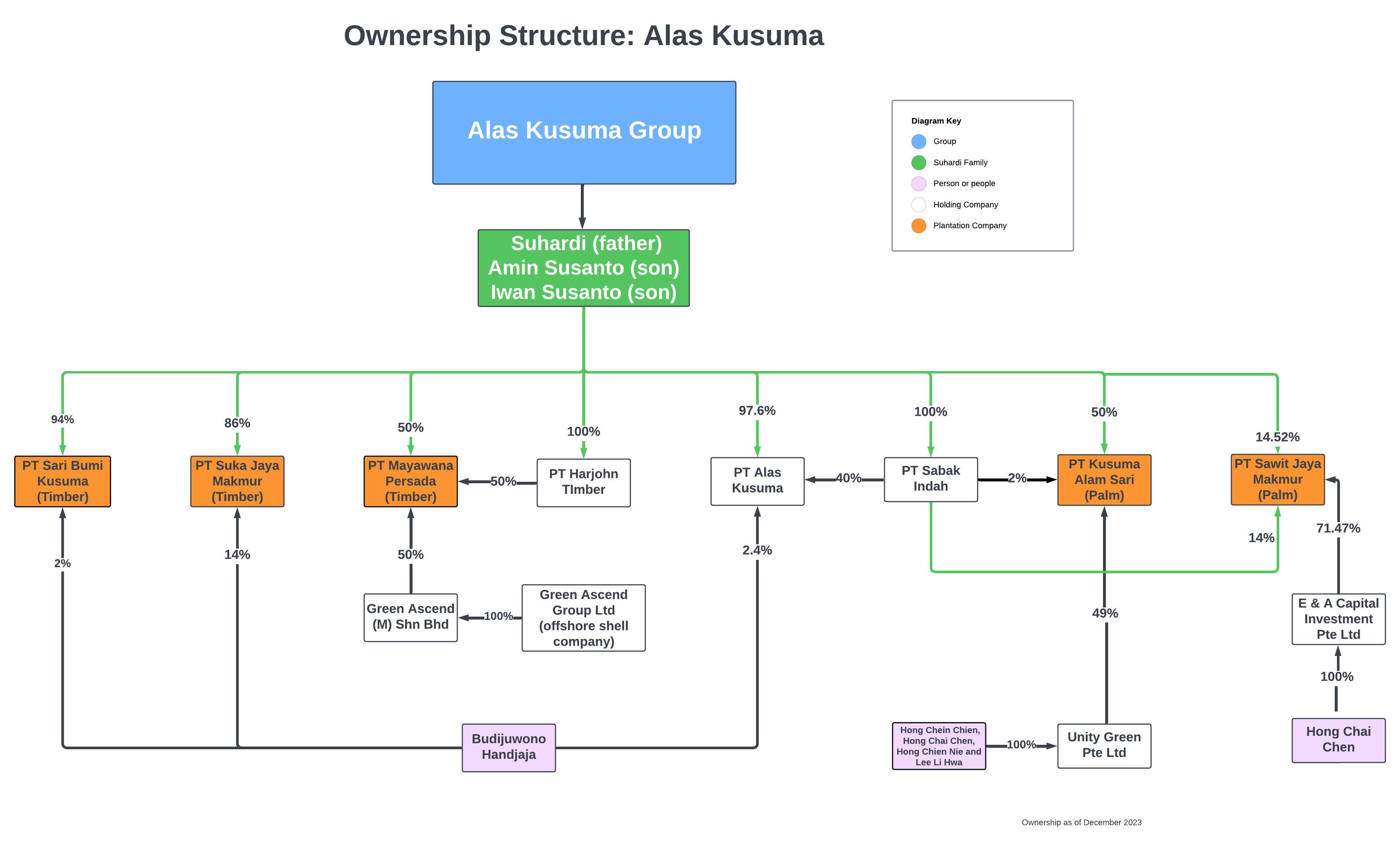 Our research shows that between 2016 and 2022 the Alas Kusuma Group companies (PT Harjohn Timber, PT Sari Bumi Kusuma, PT Suka Jaya Makmur, PT Kusuma Alam Sari and PT Mayawana Persada) were all ultimately controlled by an elderly Chinese businessman known as ‘Suhadi’ (born 1926 in China) and his immediate family members: Amin Susanto (Suhadi’s son, born 1956), Iwan Susanto (Suhadi’s son, born 1959), Jeffrey Susanto (Suhadi’s grandson, born 1991) and Nani Susanto (assumed wife of Suhadi, born 1931). The company ownership profiles show that Suhadi and his family members named above are all registered at the same residential address in Jakarta.